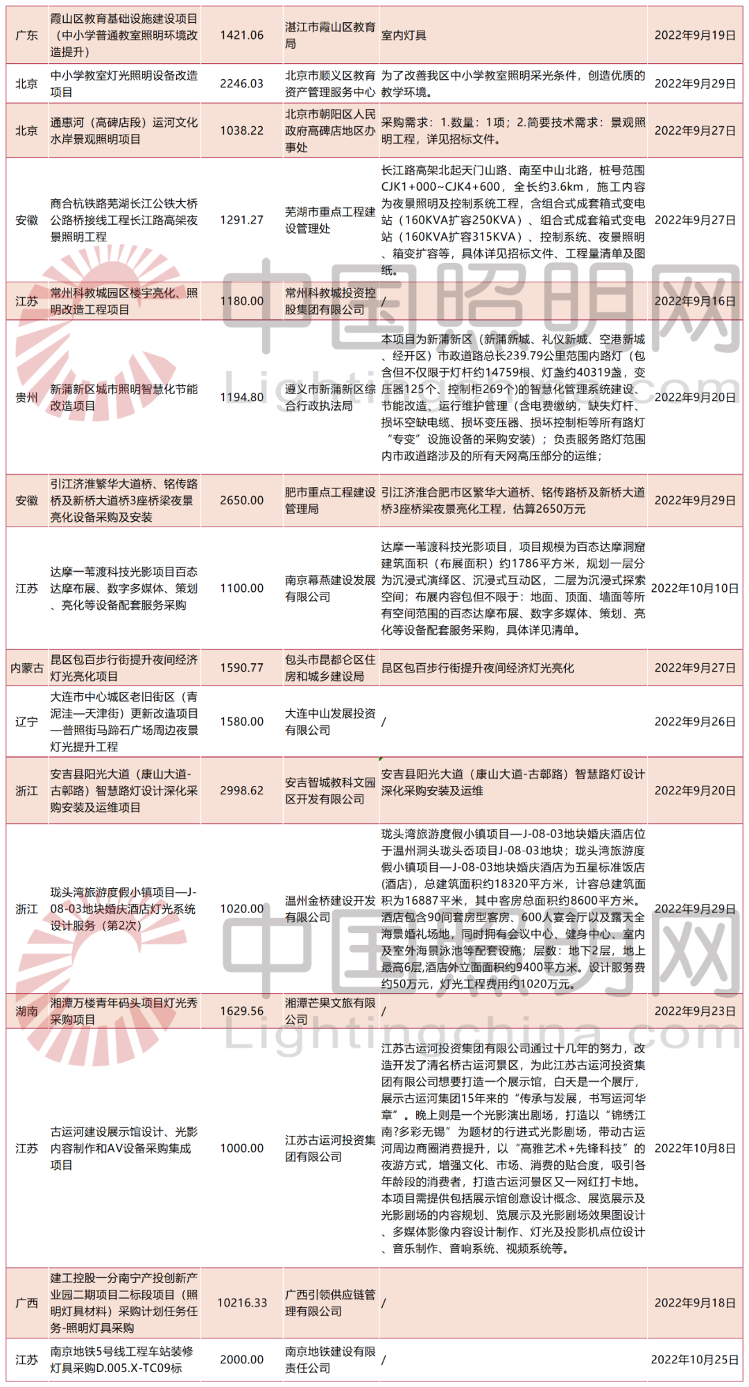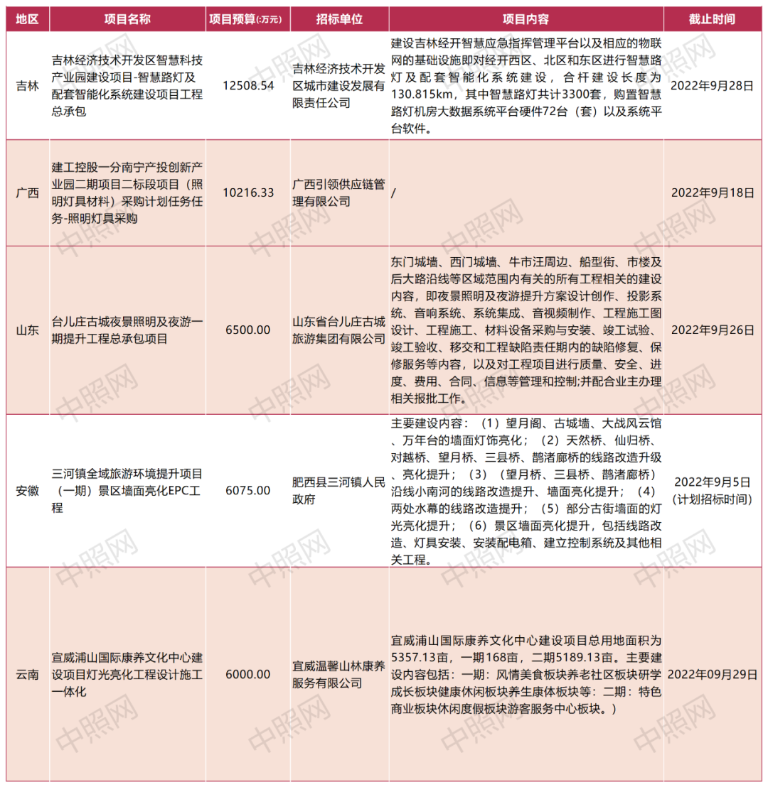 《吉林经济技术开发区智慧科技产业园建设项目-智慧路灯及配套智能化系统建设项目工程总承包》、《建工控股一分南宁产投创新产业园二期项目二标段项目(照明灯具材料)采购计划任务任务-照明灯具采购》、《台儿庄古城夜景照明及夜游一期提升工程总承包项目》、《三河镇全域旅游环境提升项目(一期)景区墙面亮化EPC工程》、《宣威浦山国际康养文化中心建设项目灯光亮化工程设计施工一体化》五项招标金额在五千万以上,分别为12508.54万元、10216.33万元、6500万元、6075万元、6000万元。
