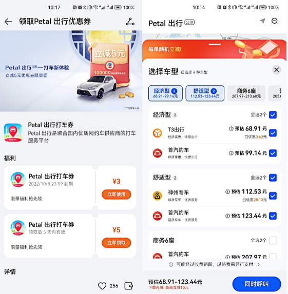 1)9月10日-12日中秋假期期间,用户可在“福利中心”领取Petal 出行“专享3元或5元优惠券”,数量有限,领完即止;