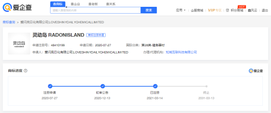 据爱企查App显示,“灵动岛 RADONISLAND”商标已被香港企业爱闪亮日化有限公司申请注册,申请时间为2020年7月,于2021年3月完成注册,国际分类为第28类-健身器材,专用权期限为2021-03-14至2031-03-13。
