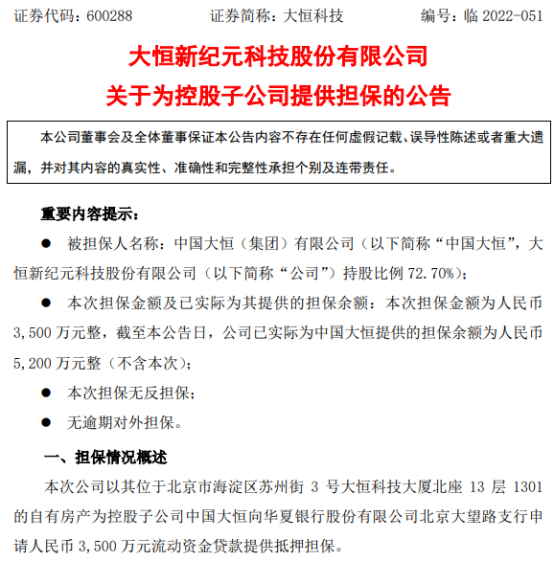 公告显示,本次公司以其位于北京市海淀区苏州街 3 号大恒科技大厦北座13层1301的自有房产为控股子公司中国大恒向华夏银行股份有限公司北京大望路支行申请人民币3,500万元流动资金贷款提供抵押担保。