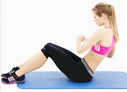 动作要领:双腿抬起,大小腿成90°,向上时,上半身向躯干靠拢,向下时,肩胛骨贴近地面。
