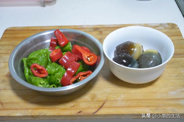 辣椒炒皮蛋:准备好辣椒,去蒂洗干净之后切成大块或直接用手掰成碎块也可以。皮蛋三个,人多多放几个也是可以的,葱花少许。