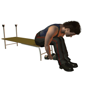 双手持哑铃,屈膝双腿,做在哑铃凳上。