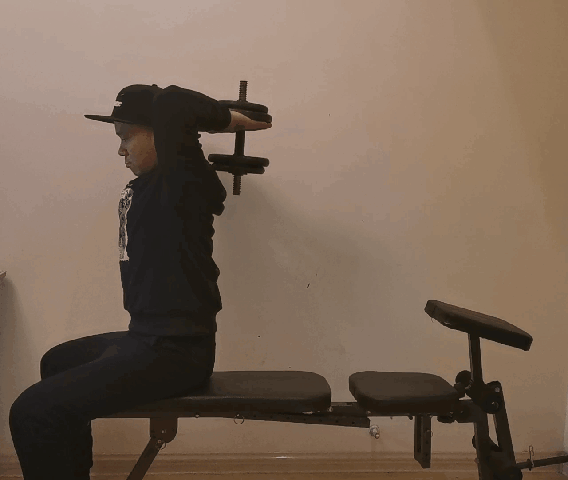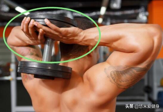 注意:需要用双手手掌托着哑铃顶端,最顶端需要低于头顶位置,这样可以加长哑铃运动距离。