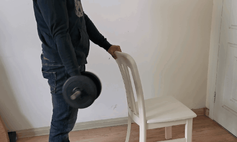 做完指定次数后,再换右手扶着椅子,左手持哑铃做动作,如此交替重复。