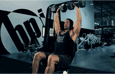 始终保持背部贴紧靠背,向上推起哑铃时,做到两只哑铃快要触碰即可,不用完全伸直手臂。感受到三角肌前束发来,避免耸肩。