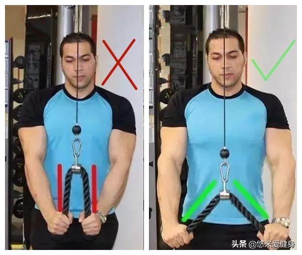 向下拉动绳索后,需要做到完全伸直手臂,同时还要将绳索向着两端分开一些,这样外侧头才有明显受力。