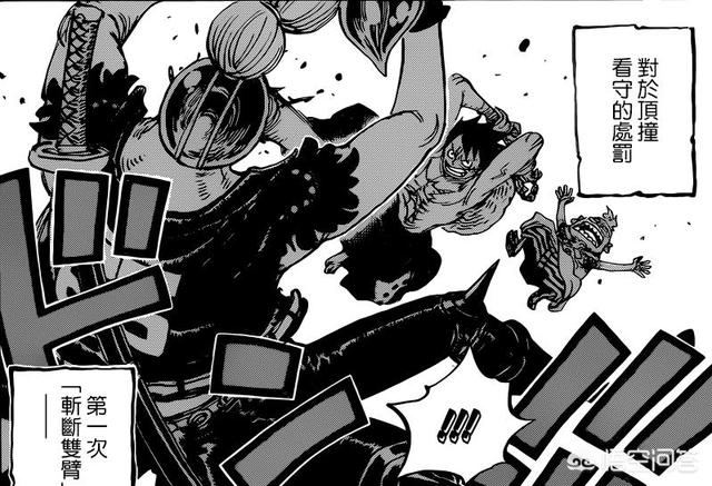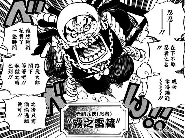 而且就在这时,凯多旗下的三灾之首的Queen也来到了采石场,得知了基德已经成功越狱,而路飞也开始准备越狱,所以就派出了手下把正在越狱的路飞给逮了,并且把豹大叔和路飞都带到了Queen的身边,而雷藏正躲在一旁仔细观察,准备寻找机会替路飞打开海楼石的手铐。