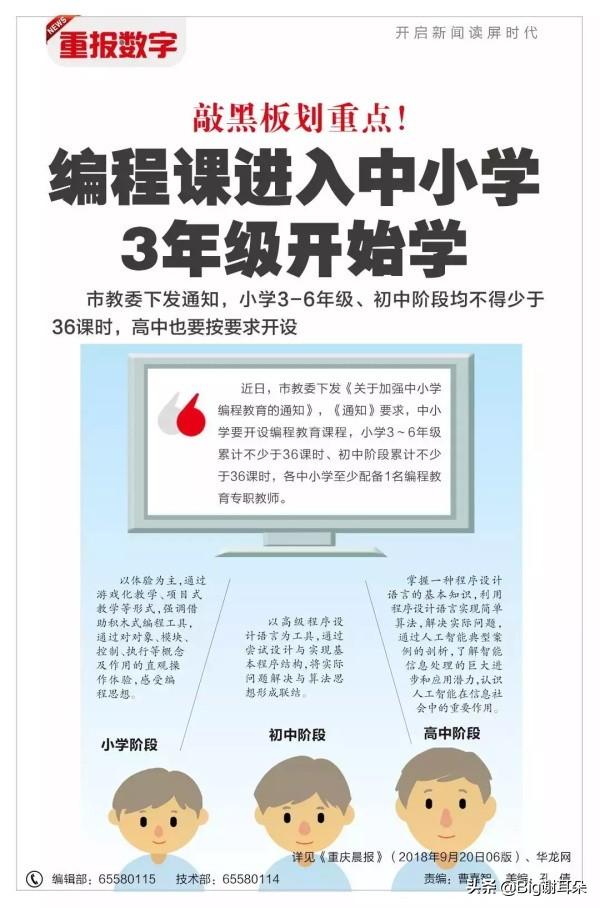 我国的几个省份陆续在中高考中加入了编程考点,在继浙江、山东、北京、江苏等省份之后,重庆市也下发了《关于加强中小学编程教育的通知》,通知要求如下:各中小学开足、开齐编程教育课程,小学3-6年级、初中阶段均不得少于36课时,高中也要按要求开设。
