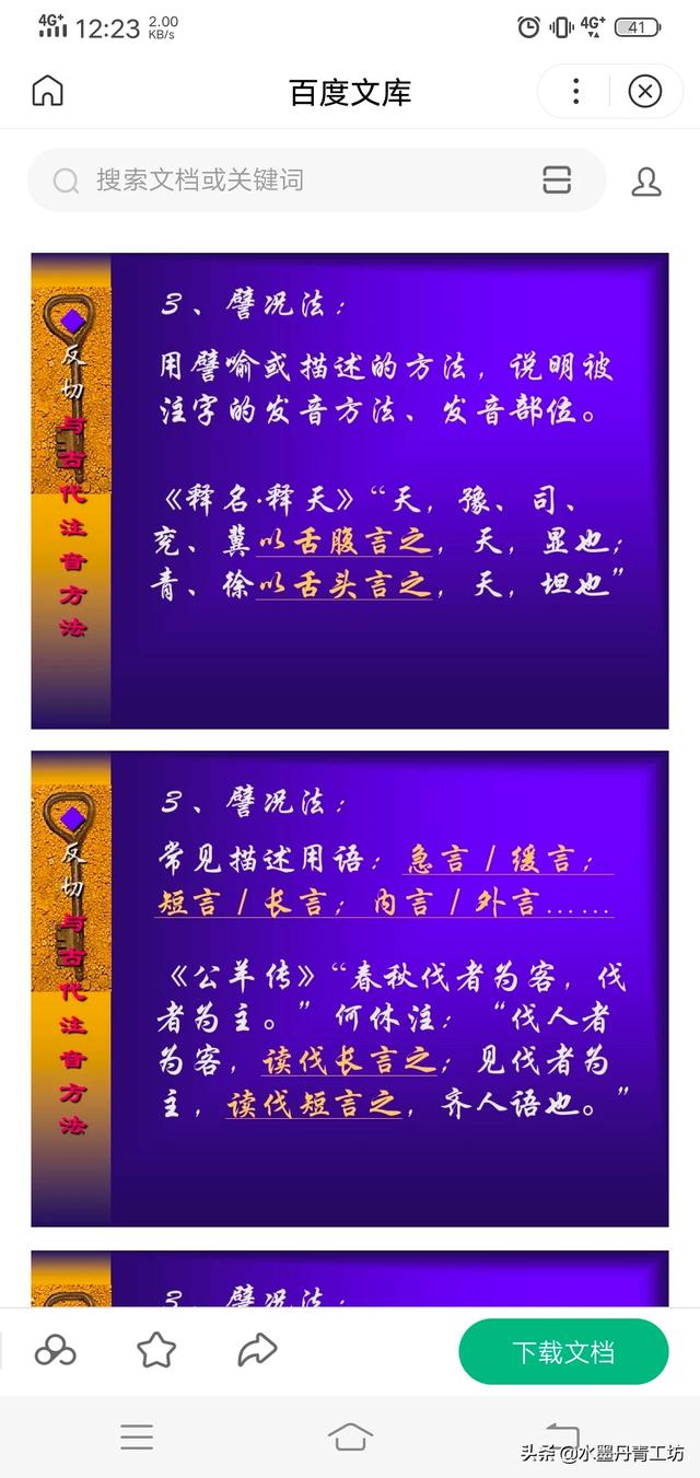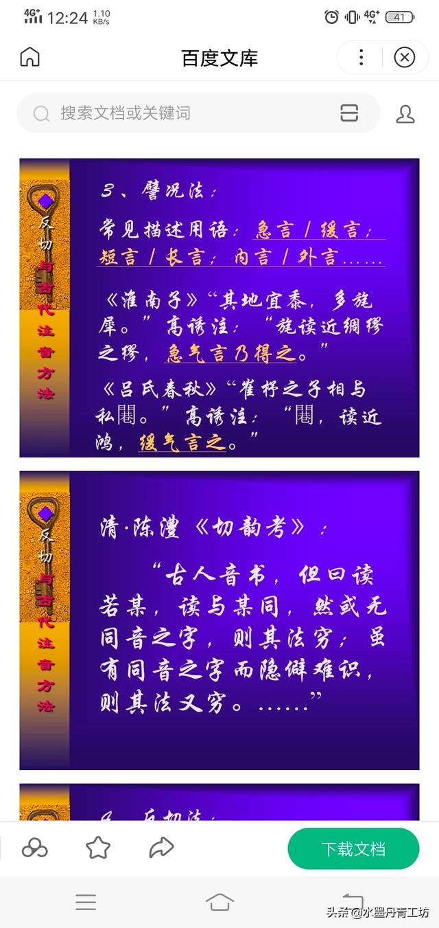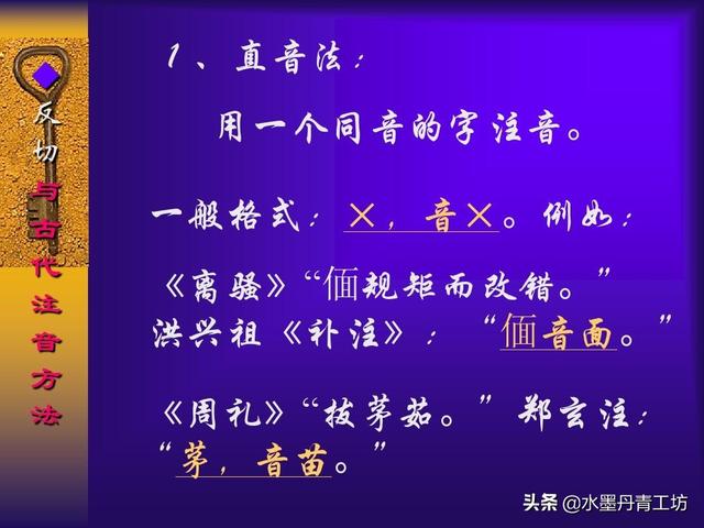 大概于东汉末年,出现了反切。即用两个字,取第一字的声母与第二字的韵母来注音。当然,取两种单音节来标注一个字,就容易多了。但是,古代的注音无论是哪种方法都不能全面地诠释上古读音的规律。所以,我们在这里就不讨论反切以及古代注音问题。