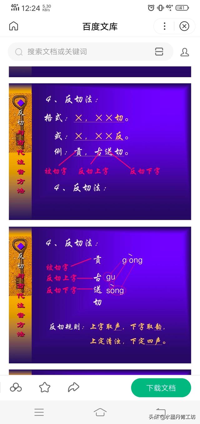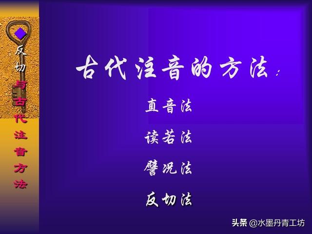 其是汉末出现的,我国古代最重要的一个给汉字注音的方法,反切法是用两个汉字给另一个汉字注音,用来注音的两个汉字;