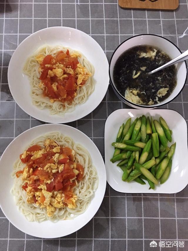 第八天,番茄炒蛋面,炒青菜和紫菜蛋花汤。