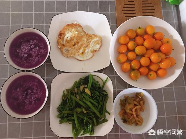 第五天,紫薯粥,炒空心菜,榨菜,煎蛋和金桔。