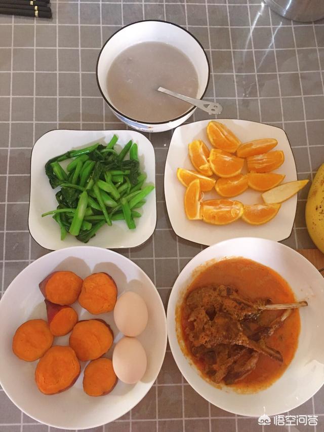 第七天,地瓜,煮鸡蛋,芋头汤,炒青菜和咖喱羊排。