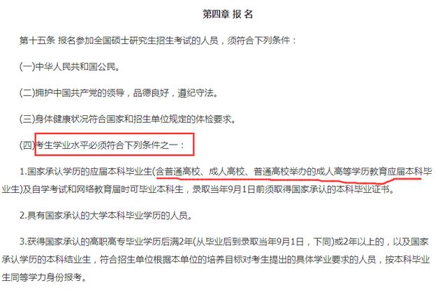 2、其次我们以教育部发布的《2018年全国硕士研究生招生工作管理规定》为例来分析,在该文件的第四章报名一款中就明确了报考者的范围(如下图)。专升本作为国家承认的学历当然也可以考研。