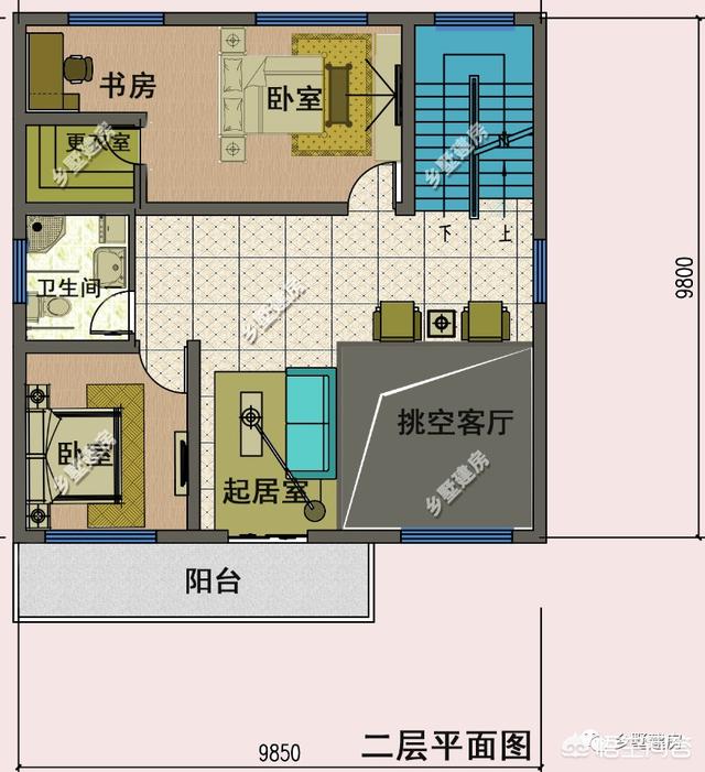 二层设有2卧室、起居室、更衣室、阳台、书房、卫生间。