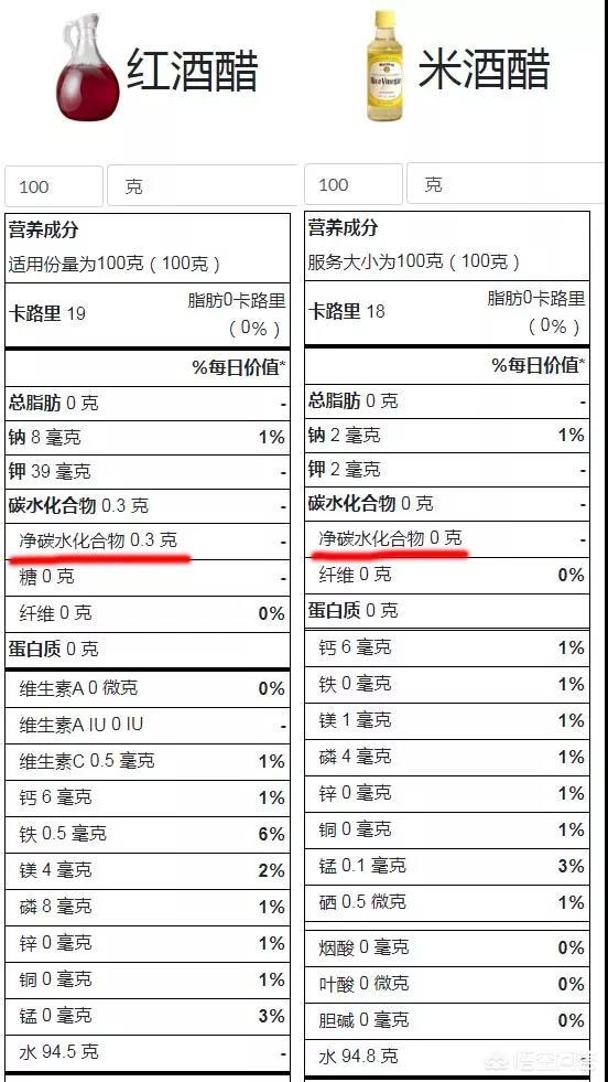 而关于醋的营养成分,我搜集了纯“红酒醋”和“米酒醋”的数据给大家做参考:▼