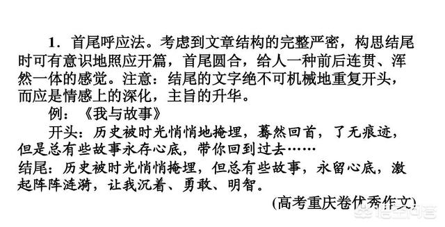 文章开头结尾的技巧,不下几十种,但最应该学会的是首尾照应法,倒叙法、抒情式开关,引用式开头、设问式开头、升华式结尾,引申式结尾等方法,而这些方法理解起来不难,但运用起来却不易,要结合名作名篇或满分作文来感悟并仿写运用。