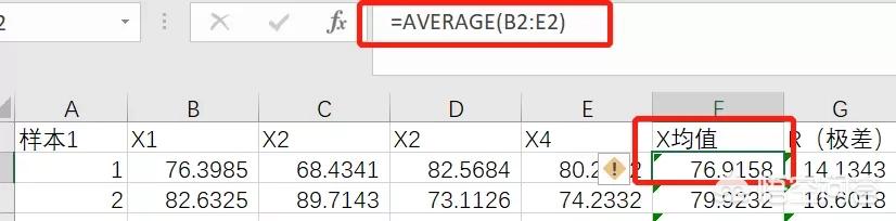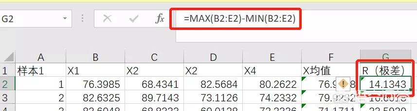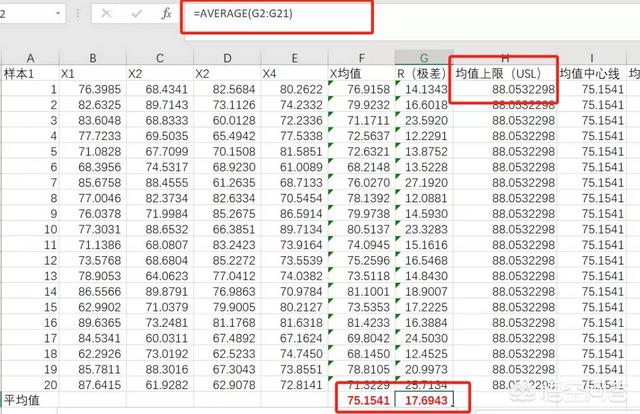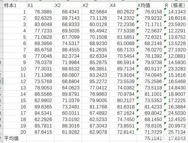 首先要有以下数据,本例中是20组样本,每个样本采集了4次数据值,分别求出每个样本的均值和极差(R)。