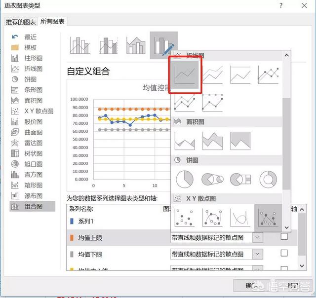 4)、微调。右键更改系列图表类型,将均值上限、下限和中心线都改成折线图。