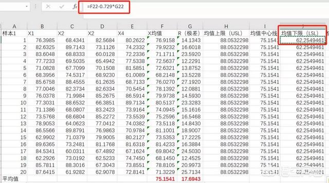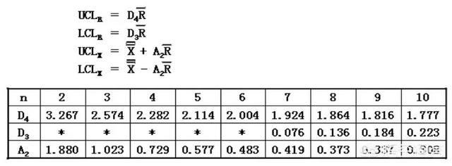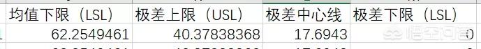 查表得出A2、D3和D4的值,n是每个样本试验的次数,这里n=4,所以A2=0.729,D3=正无穷,D4=2.282,套进公式,可以得出均值和极差的上下限值,中心线即X和R各自的均值。