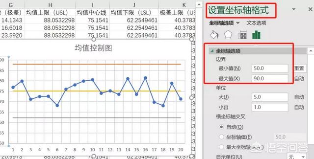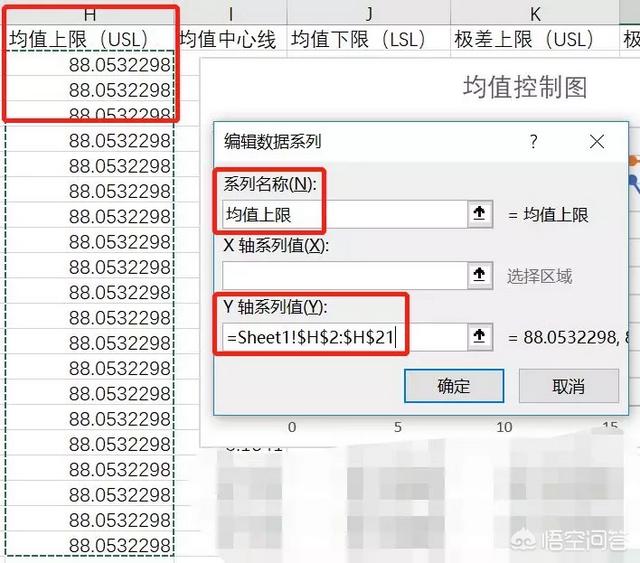 2)、控制图上限。右键选择数据,添加,系列名称改为均值上限,Y轴系列值选中刚刚算出的均值上限H一列。