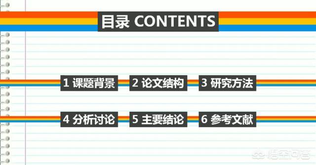 正常来讲论文答辩的ppt包含6个方面“课题背景、论文结构、研究方法、分析讨论、主要结论、参考文献”,具体的根据专业情况以自己的论文结构为依据可以自行删减。