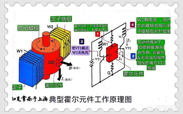 霍尔元件上下经限流电阻接到直流电源上,有偏流流过使晶体管按照对应方向截止或导通。(如下图所示),这样在定子W1线圈与定子w2定子线圈中,它受霍尔元件变化检测的信号而改变,形成旋转运动。