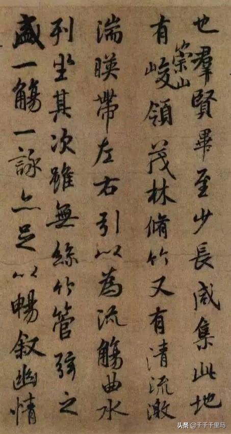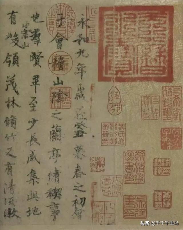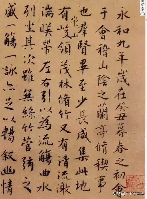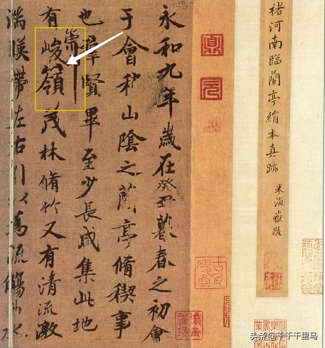 - 褚遂良临摹的“黄绢本”《兰亭序》“此地有崇山峻领”的领字有“山字头”,此本有米芾题跋
