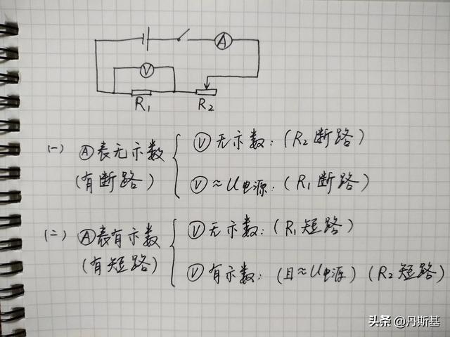 这时,如果电压表没有示数,那么就是定值电阻被短路了。因为这个时候,电流会从导线流过,电压表相当于也被短路了,所以电压表就没有示数。