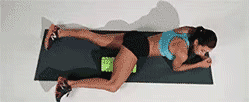 俯卧,手肘支撑,弯曲一侧腿部,大小腿90度夹角,泡沫轴放在大腿内侧,左右滚动大腿内侧肌肉。动态滚动1分钟。