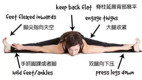 坐角式。坐立在垫子上,双腿向外侧打开,保持双脚脚趾回勾,吸气伸展脊柱,呼气以髋部为折点向前向下前屈。静态保持1分钟的时间。