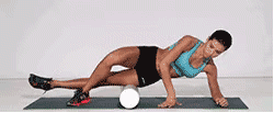 侧卧,手肘支撑,上方脚踩地,泡沫轴放在大腿外侧,前后滚动大腿外侧。动态滚动1分钟。