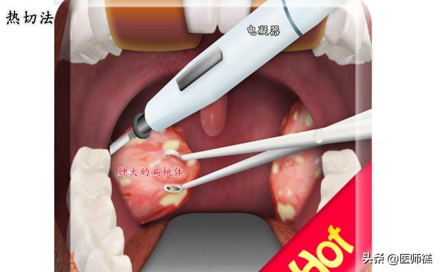 - 热切发:热切发和冷切法的区别主要在于使用电凝器进行手术操作,由于存在使用电凝器及时患者在手术过程中存在出血通过电凝器发热也可以及时的进行电凝止血,避免了出血对手术视野的干扰,在直视下手术可以彻底清除扁桃体的下极残留。同时电凝止血可以边止血边分离,避免了多次缝合结扎的止血操作,减少了对咽部黏膜的刺激,缩短了手术的时间,也尽可能避免了日后感染、以及肺部并发症的可能。