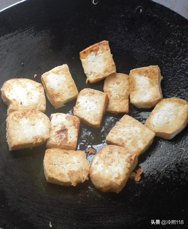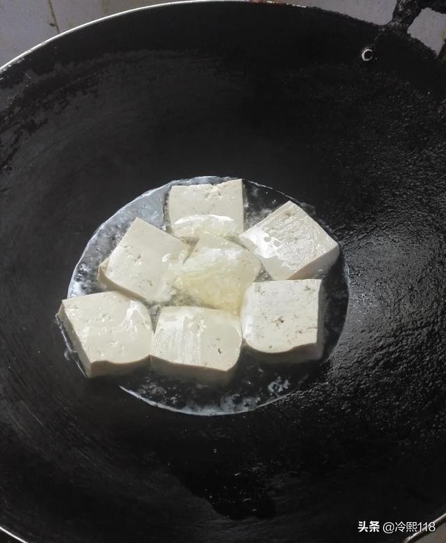 在锅中放入适量色拉油,烧热后放入切好的豆腐块;