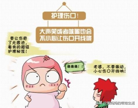 1.注意清洁卫生和护理伤口。产后24个小时内,产妇就被要求下床走动了,虽然很疼,但是有些事情不会改变~产后都会有恶露,所以新妈妈需要保持会阴的清洁卫生,伤口也需要护理,在出院那天,医生一般都会帮忙换一次药,两三天之后就可以把伤口胶布揭下来,然后每天用消毒药水喷洗两次,产后两周内洗澡的时候一定要注意伤口一定不能碰到水。