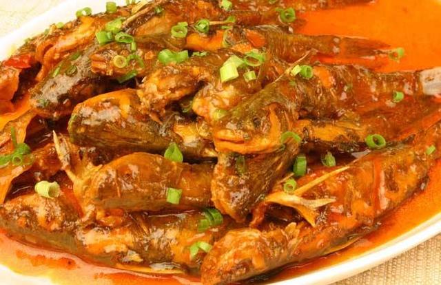 4.热锅放菜籽油、猪油,下姜、蒜沫炒香,接着放小米椒沫,再放豆瓣酱、辣妹子,炒香炒出红油,放适量高汤,调少许盐、味精、鸡精、红烧酱油白糖,放入煎好的黄鸭叫烧至汤汁浓稠,放入紫苏丝、少许胡椒粉,把黄骨鱼先打出来摆好盘,再把锅里汤汁用湿淀粉勾点油芡淋在黄鸭叫上面,最后撒少许葱花即可。