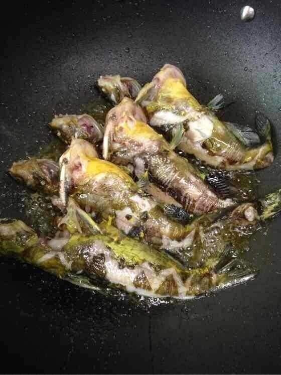 3.把锅滑透,热锅放菜籽油、猪油,去半勺盐,把黄骨鱼放下去小火煎至两面金黄倒出备用;