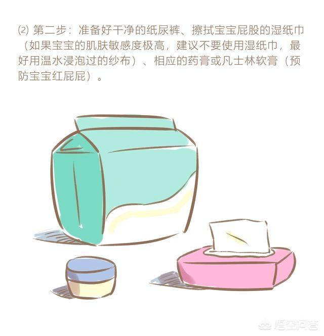 准备好干净的纸尿裤、擦拭宝宝屁股的湿纸巾(如果宝宝的肌肤敏感度极高,建议不要使用湿纸巾,最好用温水浸泡过的纱布)、相应的药膏或凡士林软膏(预防宝宝红屁屁)。