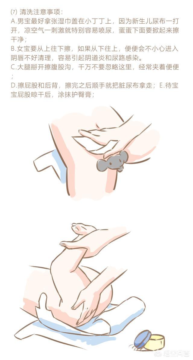 A.男宝最好拿张湿巾盖在小丁丁上,因为新生儿尿布一打开,凉空气一刺激就特别容易喷尿,蛋蛋下面要掀起来擦干净;
