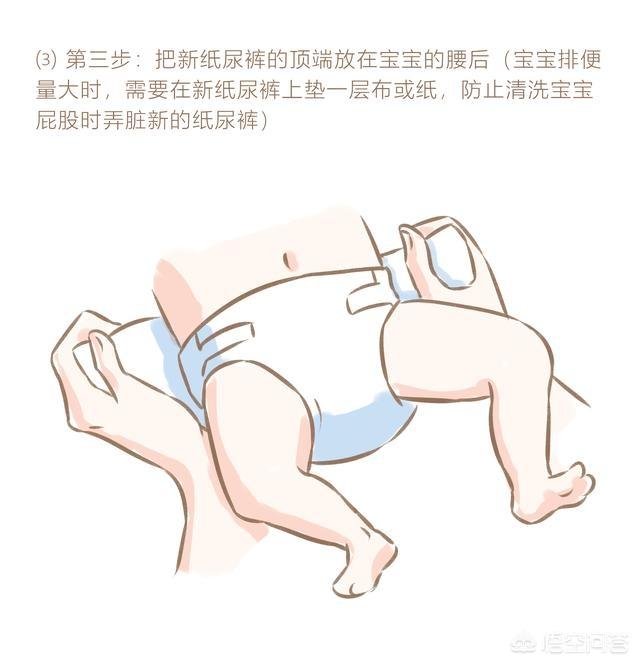 把新纸尿裤的顶端放在宝宝的腰后(宝宝排便量大时,需要在新纸尿裤上垫一层布或纸,防止清洗宝宝屁股时弄脏新的纸尿裤)。
