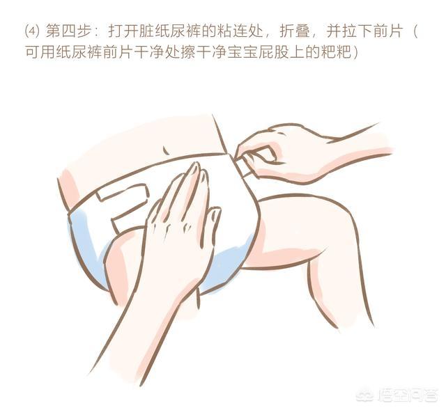 打开脏纸尿裤的粘连处,折叠,并拉下前片(可用纸尿裤前片干净处擦干净宝宝屁股上的粑粑)。