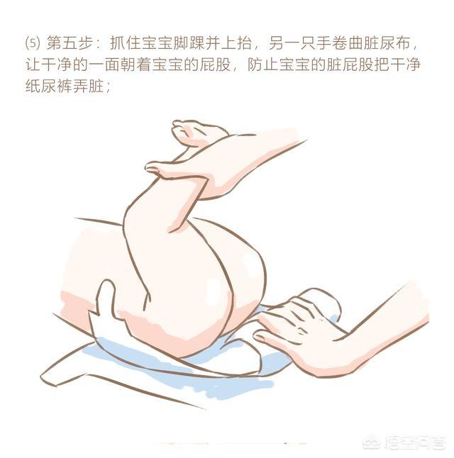 抓住宝宝脚踝并上抬,另一只手卷曲脏尿布,让干净的一面朝着宝宝的屁股,防止宝宝的脏屁股把干净纸尿裤弄脏。