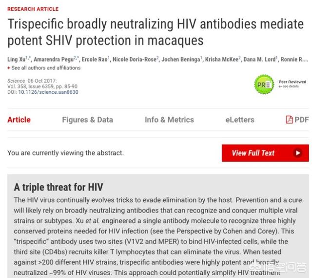 2017年10月,有一项发表在著名《科学》杂志的研究说,研究人员开发的新艾滋病抗体已经进入灵长类实验。“三合一“抗体成功让猿类抵御艾滋病病毒。虽然猿类艾滋病疫苗从2012年就开始实验,这次算是完全拿下了这一最接近人的物种,可以中和患病猴子体内99%的艾滋病病毒,这个抗体马上会投入到人类临床实验中,被称为最有希望的艾滋病治疗手段之一。