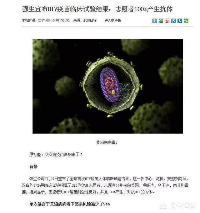 2017年7月,美国强生子公司以口头报告的形式公布了一个具有突破性的HIV疫苗临床试验结果:393名来自全球各地的健康志愿者在接种HIV疫苗后,100%出现免疫反应。