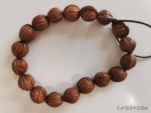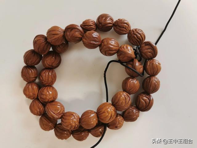 晾干后再用刷子刷理一下,就可以进行选型了。根据自己需要制作手串的颗粒数选取型状、大小相近的桃核备用。