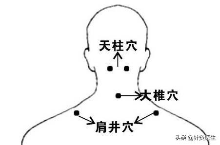 按揉方向:天柱穴、肩井穴可拿捏50次,大椎穴可顺时针按揉100圈,再逆时针按揉100圈。