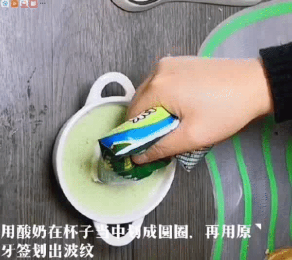 3、把奶昔盛到碗里,再把酸奶的袋子的一端用小剪刀剪个小小的口,用酸奶在奶昔上画圆圈。再用牙签儿,划出波纹。