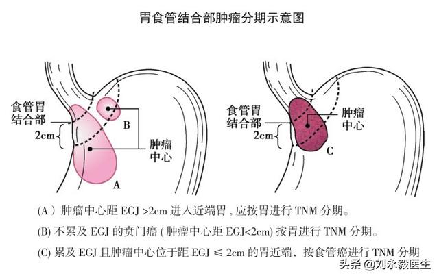 贲门是食管的末端、胃的入口,那么、贲门癌以食管癌、还是以胃癌的方案去治疗呢?以往由于手术有可能开胸,一般按食管癌来处理。现在以肿瘤中心与食管胃结合部EGJ位置关系而划归胃癌、或食管癌分期,如下图所示,而根据相应的诊疗指南选择治疗方案。