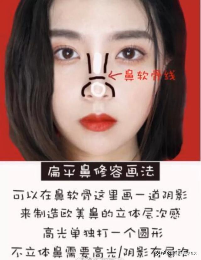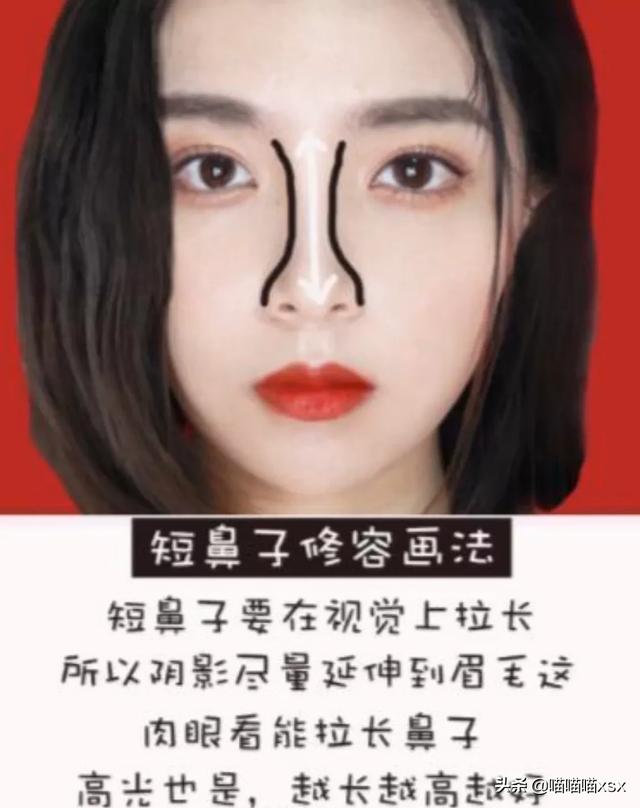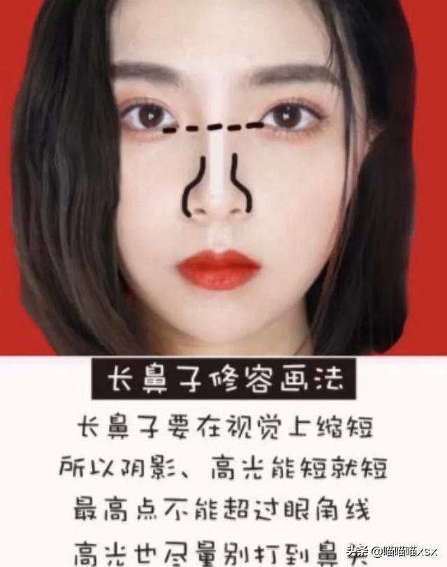 - 鼻梁过长:鼻梁太长的女生,请把重点放在眉头及鼻头,注意不要再将鼻梁打亮,这便能忽略鼻梁太长的缺点!